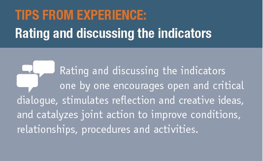 6.6 Then, starting with the first indicator, ask the group to give it a score. Use one methodology of scoring for uniform results (see appendix 1.5 for different techniques). Make sure the group has agreed on the score before writing it up on the matrix (see matrix in step 5, appendix 1.4). Also check that each score represents the views of the more quiet people.
