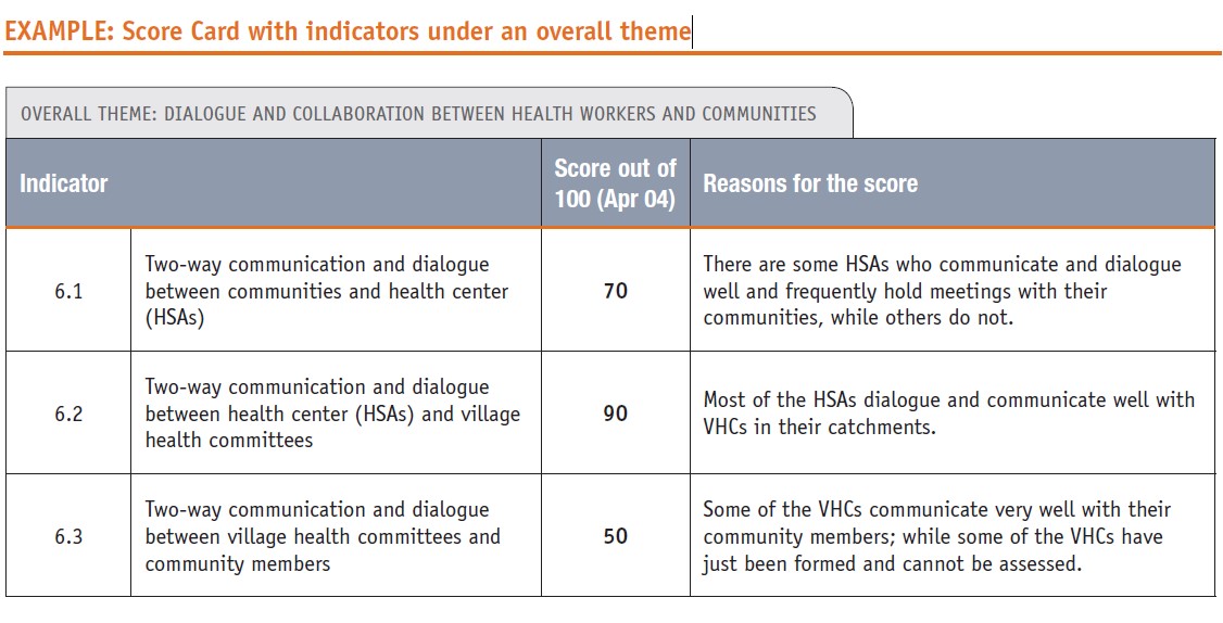 NOTE: Make sure that the community does not view the service provider as a child that needs to be awarded a mark (despite this being used to illustrate the “percentage” technique of scoring outlined below), as this can lead to the service providers being undermined by the community and even mocked. Also, explain the implications of the scores.