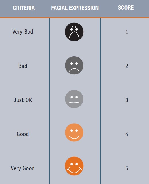 Ask the group to choose a face (see diagram) that shows how they feel about the various indicators (Thindwa et al, 2005). This technique is simple and straight forward but it might not be able to represent the gravity of the issues as compared to scoring with numbers on a scale of 0% to 100%. It does not allow the community to express the situations found in between each pair of two faces.