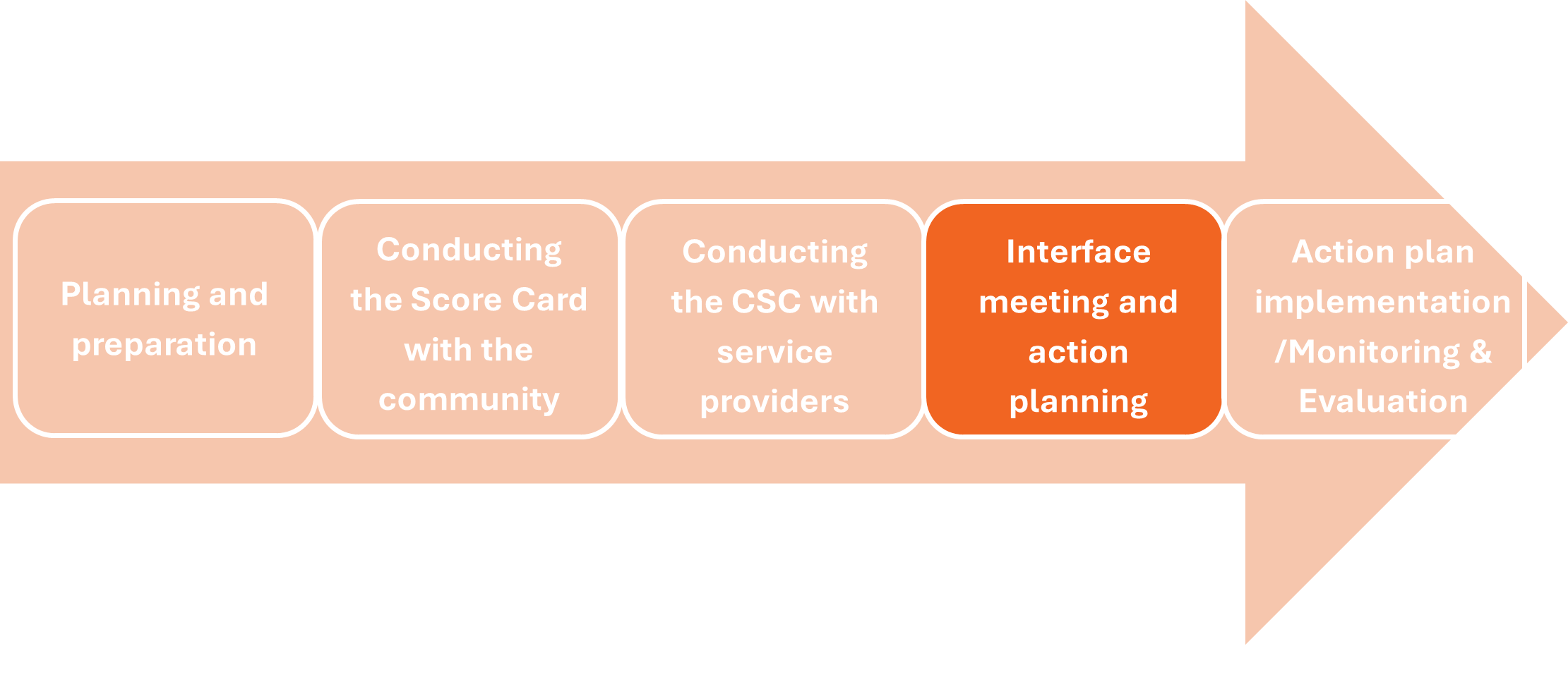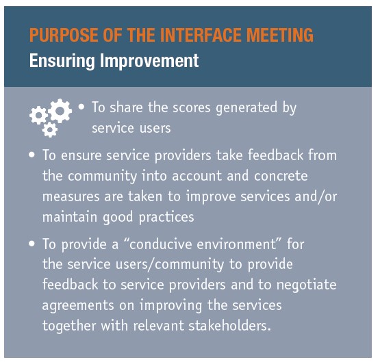 The interface meeting brings service users, service providers and other interested/relevant parties together. It is important that key decision makers (chiefs, group village headmen, district officials, ministry officials, local politicians, etc.) are present to ensure instant feedback on the issues and responsibility to take issues and the plan of action forward.