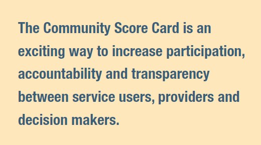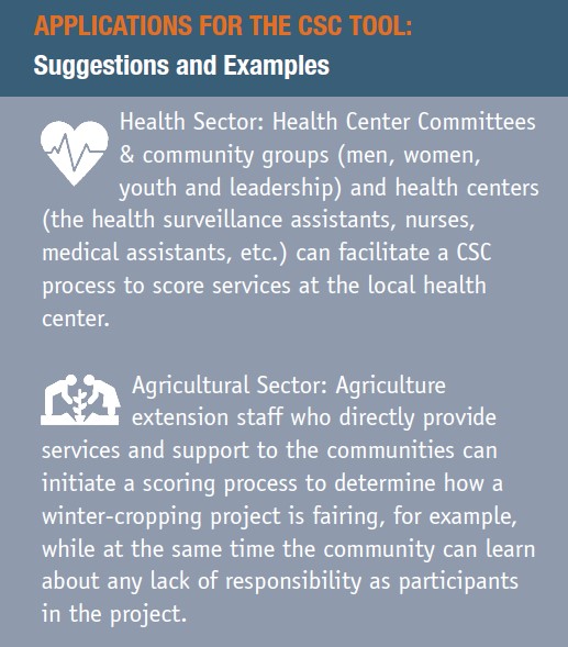 For the service provider (e.g., government agencies/institutions): The CSC helps government institutions learn directly from communities about which aspects of their services and programs are working well and which are not. The information it generates will enable power holders to make informed decisions and policy choices and implement service improvements that respond to citizens’ rights, needs and preferences.