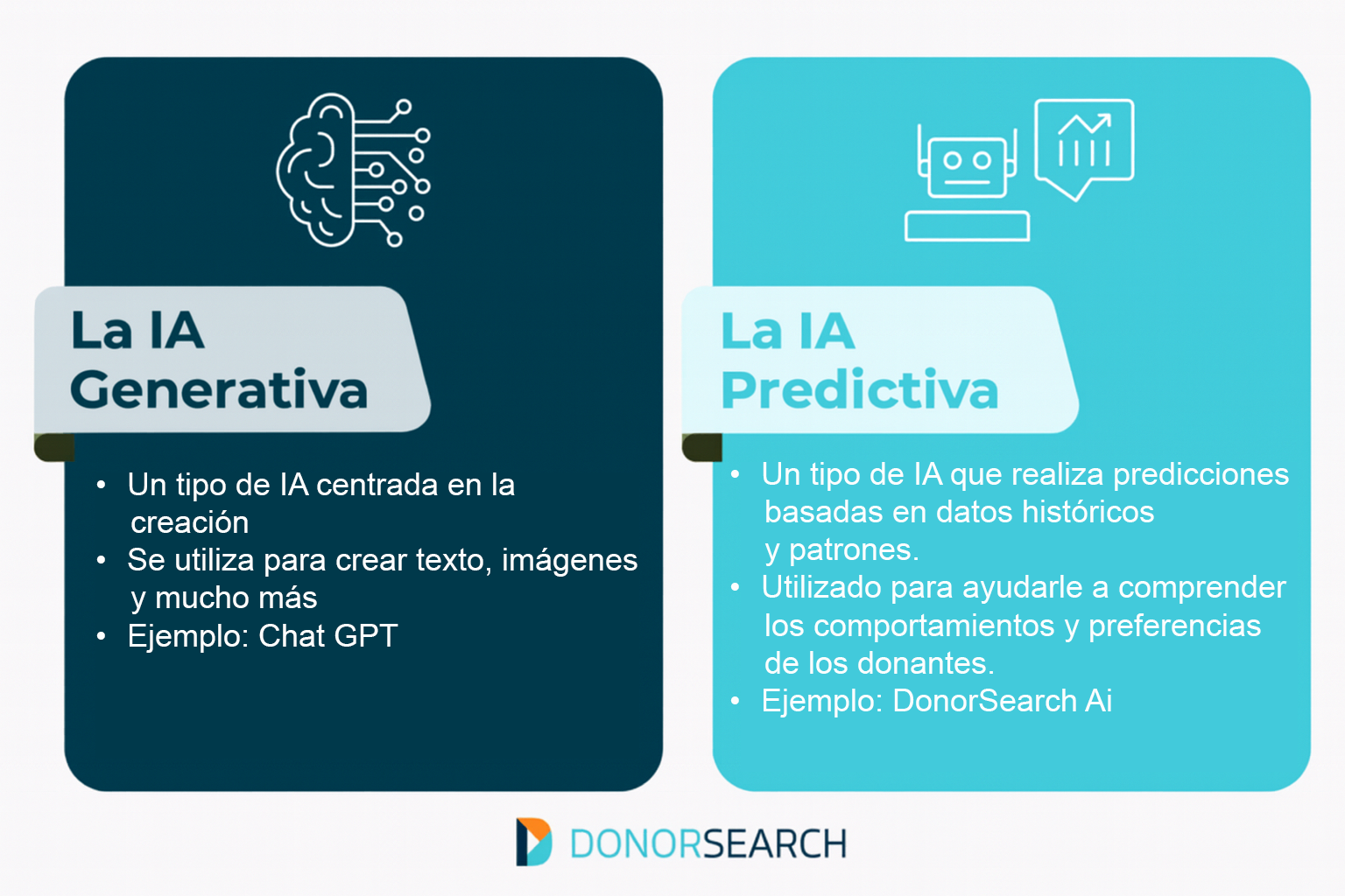Antes de sumergirse en el tema, las ONG necesitan comprender a fondo qué es y qué no es la IA. La IA se refiere a sistemas que imitan la inteligencia humana, como reconocer patrones, tomar decisiones o generar texto. Para ver cómo la IA puede ayudar a una organización sin fines de lucro como la suya, es importante comprender los dos tipos principales de herramientas de IA disponibles para su organización: la IA generativa y la IA predictiva: